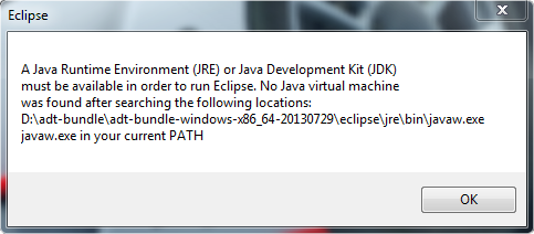 The error above is because Eclipse cannot locate the JDK directory on your computer. So the first thing you have to do is make sure you have a JDK (not just JRE) downloaded to your computer. The three most common places in your computer are: C:\Program Files (x86)\Java\ (32-bit), C:\Program Files\Java\ (64-bit) or (unlikely) C:\Java\. Make sure that inside the Java folder, you have a JDK downloaded (not just a JRE).