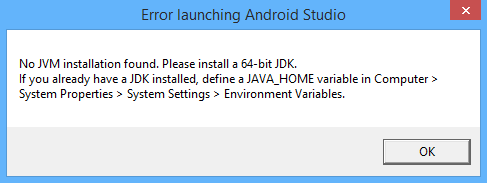 The error above is because Android Studio cannot locate the JDK directory on your computer. So the first thing you have to do is make sure you have a JDK (not just JRE) downloaded to your computer. The three most common places in your computer are: C:\Program Files (x86)\Java\ (32-bit), C:\Program Files\Java\ (64-bit) or (unlikely) C:\Java\. Make sure that inside the Java folder, you have a JDK downloaded (not just a JRE).