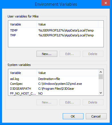 You should at least have TEMP and TMP variables. If you don't have a PATH variable, click "New..." and create one with the variable name as PATH and the variable value as the location of your JDK's bin folder. For example, the value might be C:\Program Files\Java\jdk1.8.0_31\bin. You can copy that location in Windows Explorer by navigating to it and copying the address bar. Make sure the you are using backslashes.